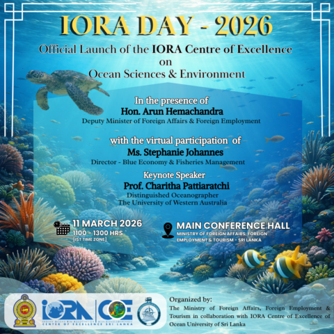 The Official Launch of the IORA-CoE will be held on 11th March 2026 by 11.00 am Onwards at the Main Conference Hall of the MINISTRY OF FOREIGN AFFAIRS, FOREIGN EMPLOYMENT & TOURISM - SRI LANKA.